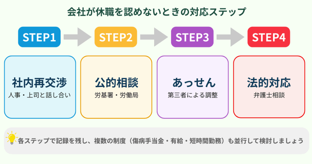 「休職は認めない」と言われても、すぐに諦める必要はありません。適切な順序で行動すれば、状況を改められる可能性があります。