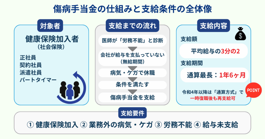 傷病手当金は、業務外の病気やケガで連続3日間の待期期間を含む4日以上仕事を休んだ場合に、4日目から支給されます。