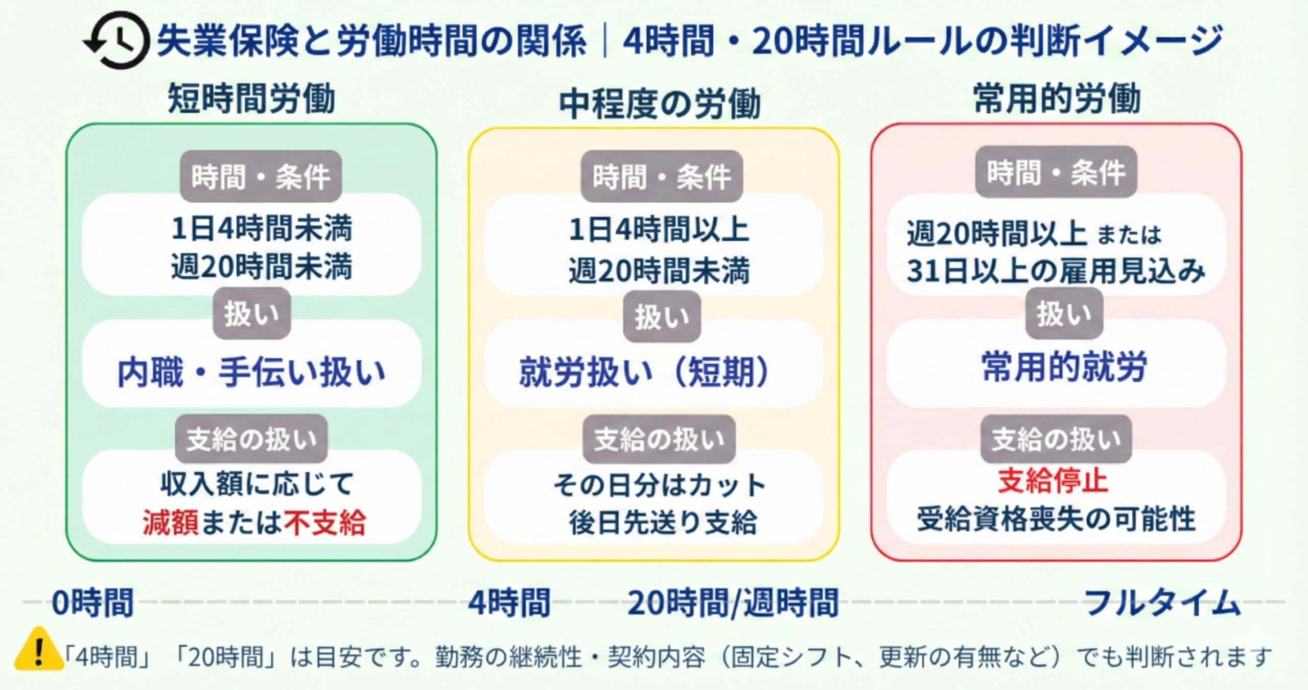 | 週20時間超 | 常用的就労 | 受給資格を失う可能性あり |